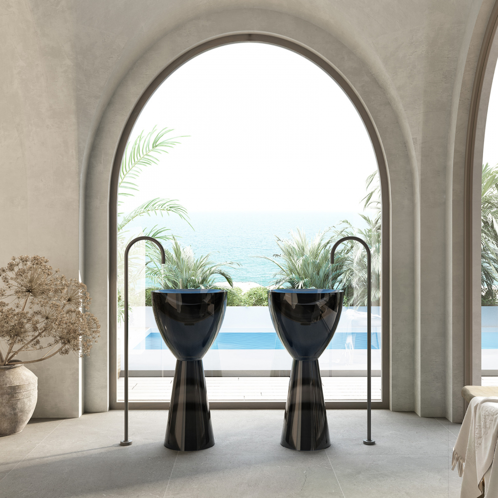 Abber Kristall Раковина отдельностоящая прозрачная круглая 45x45x90h см, цвет: черный AT2703Onyx и другие сантехнические изделия бренда характеризует надежность, высокое качество и продолжительный срок службы. Изделие в стилистике минимализм впечатляюще будет смотреться в различных цветовых решениях помещения.