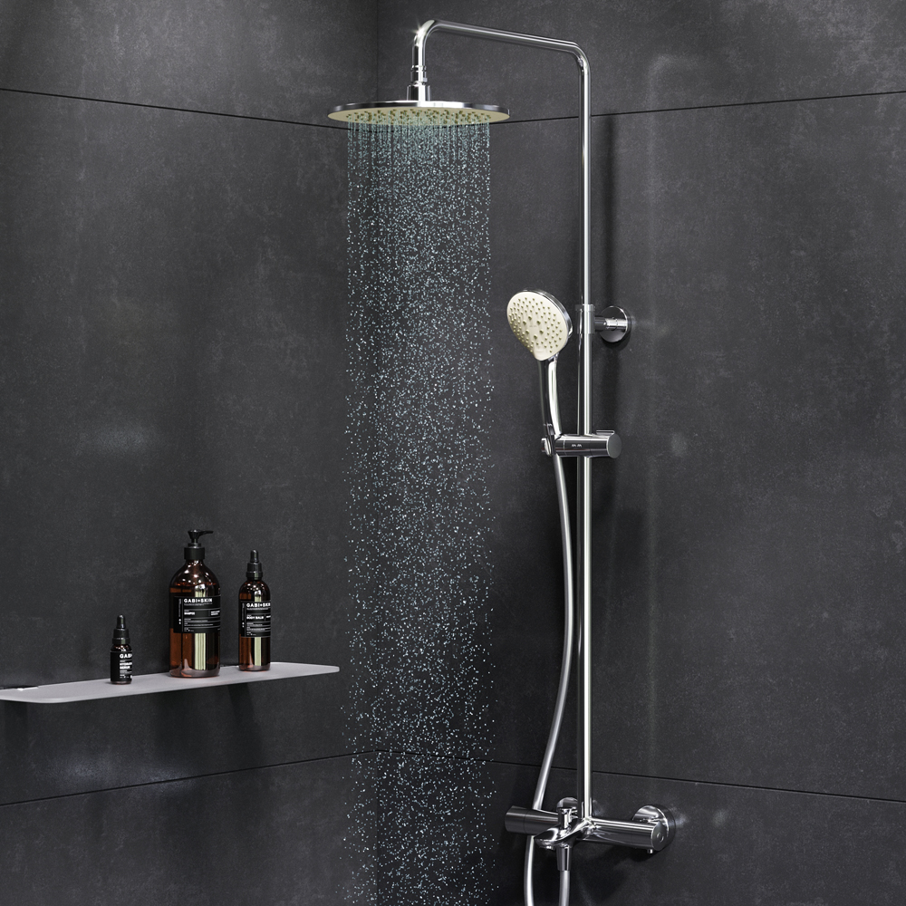 Am.Pm Gem Душевая стойка с верхним душем, цвет: хром F0790520 и другие сантехнические изделия бренда характеризует надежность, высокое качество и продолжительный срок службы. Изделие в стилистике минимализм впечатляюще будет смотреться в различных цветовых решениях помещения.