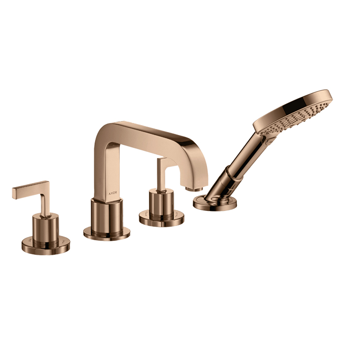 Axor Citterio Смеситель на борт ванны, с ручным душем, внешняя часть, цвет: полир. розовое золото 39446300 и другие сантехнические изделия бренда характеризует надежность, высокое качество и продолжительный срок службы. Изделие в стилистике неоклассика впечатляюще будет смотреться в различных цветовых решениях помещения.