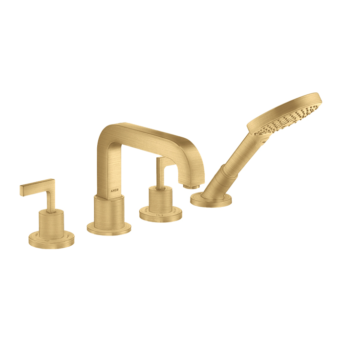 Axor Citterio Смеситель на борт ванны, с ручным душем, внешняя часть, цвет: шлифованное золото 39446250 и другие сантехнические изделия бренда характеризует надежность, высокое качество и продолжительный срок службы. Изделие в стилистике неоклассика впечатляюще будет смотреться в различных цветовых решениях помещения.