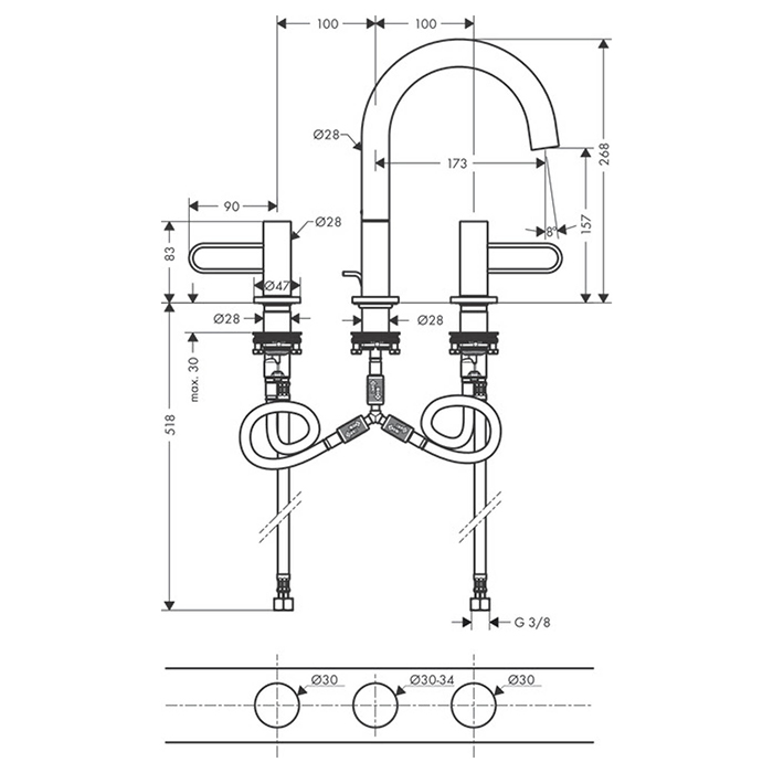 Axor Uno Смеситель для раковины двухвент. на 3 отв. с донным клап., цвет: хром 38054000 и другие сантехнические изделия бренда характеризует надежность, высокое качество и продолжительный срок службы. Изделие в стилистике лофт впечатляюще будет смотреться в различных цветовых решениях помещения.