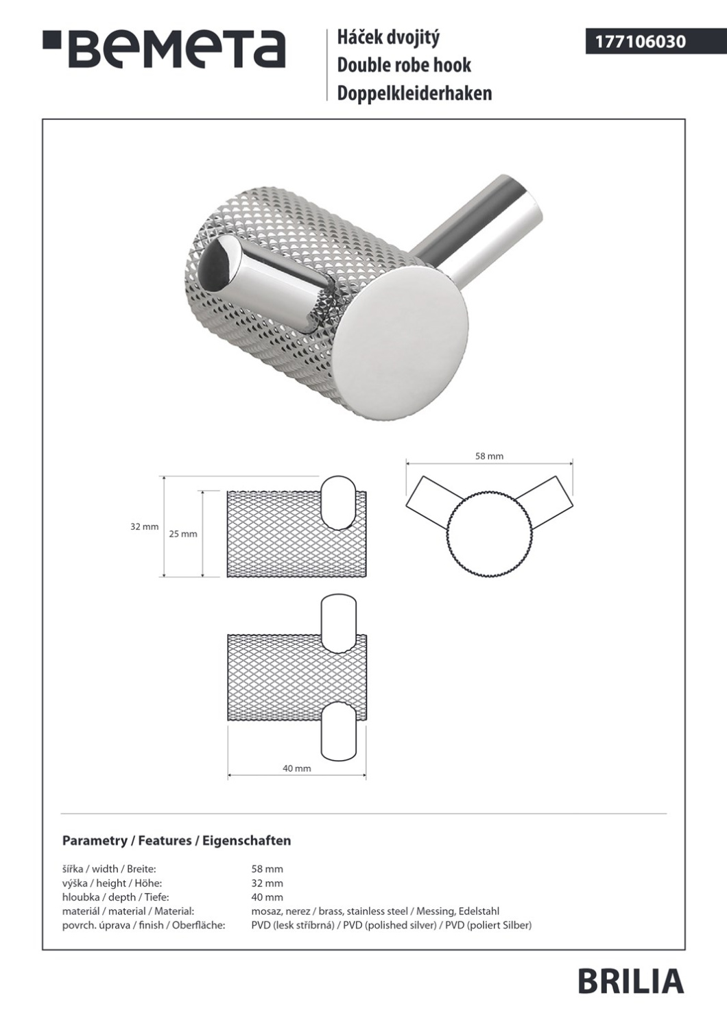 Bemeta Brilia Крючок для полотенец двойной, подвесной, цвет: полированное серебро 177106030 и другие сантехнические изделия бренда характеризует надежность, высокое качество и продолжительный срок службы. Изделие в стилистике арт-деко впечатляюще будет смотреться в различных цветовых решениях помещения.