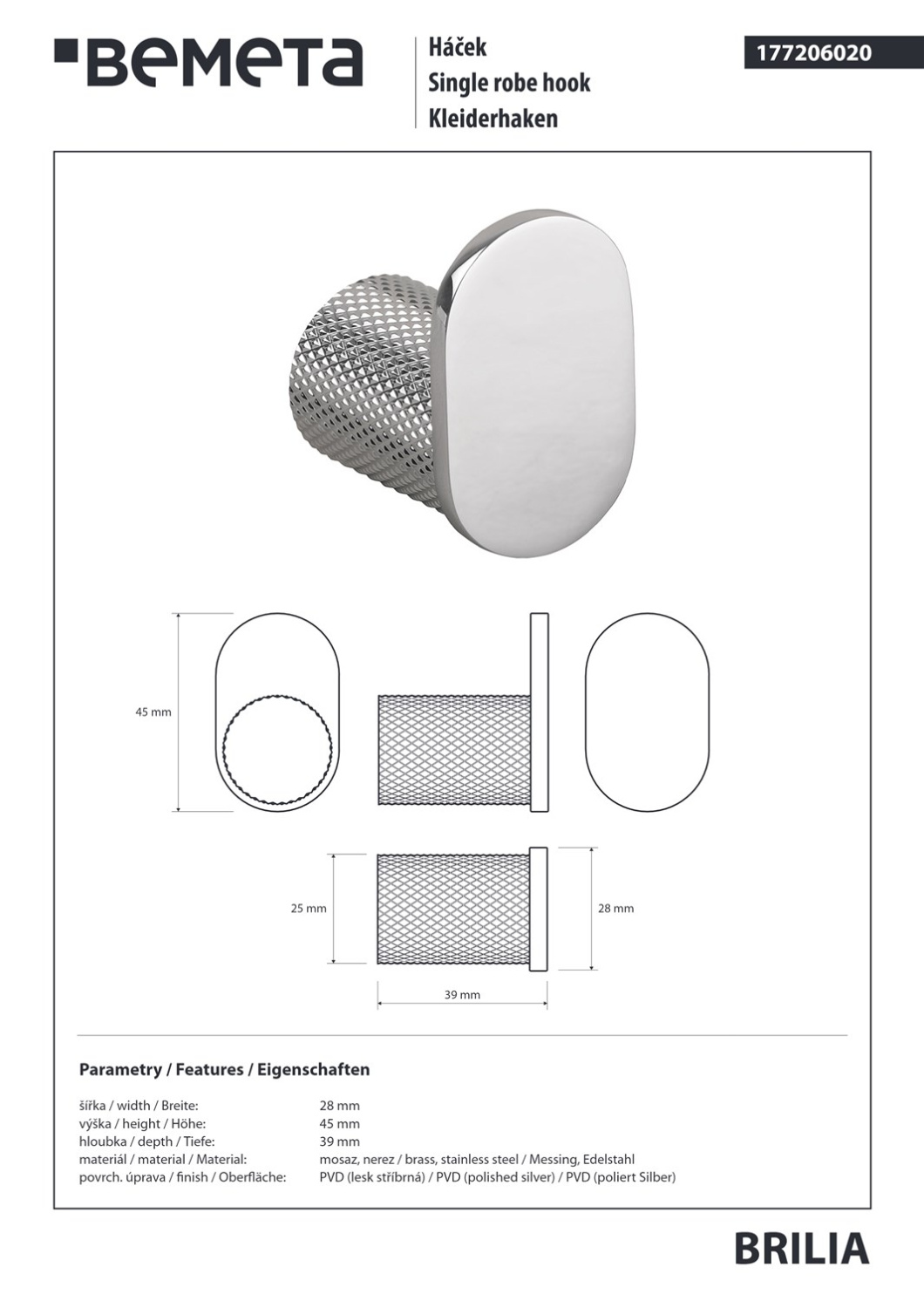 Bemeta Brilia Крючок для полотенца, подвесной, цвет: полированное серебро 177206020 и другие сантехнические изделия бренда характеризует надежность, высокое качество и продолжительный срок службы. Изделие в стилистике арт-деко впечатляюще будет смотреться в различных цветовых решениях помещения.
