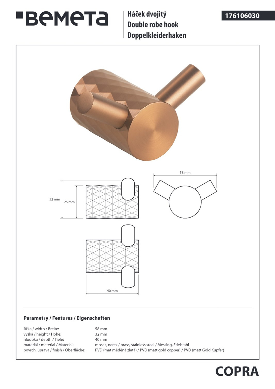 Закажите Bemeta Copra Крючок для полотенец двойной, подвесной, цвет: матовая медь 176106030 от производителя Bemeta, коллекция Copra в салоне европейской сантехники Дизайн Сантехники с быстрой доставкой по Москве. Представлены подробные характеристики и фотографии, которые позволят сделать правильный выбор и заказать товар.