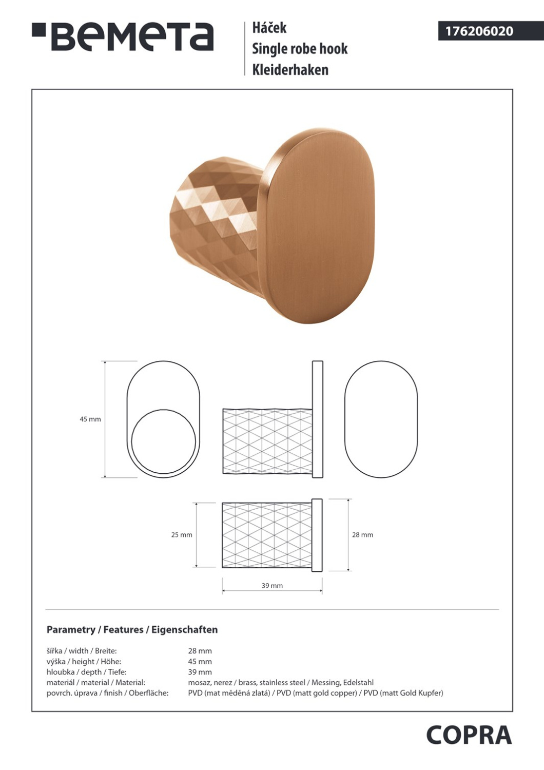 Bemeta Copra Крючок для полотенца, подвесной, цвет: матовая медь 176206020 и другие сантехнические изделия бренда характеризует надежность, высокое качество и продолжительный срок службы. Изделие в стилистике арт-деко впечатляюще будет смотреться в различных цветовых решениях помещения.