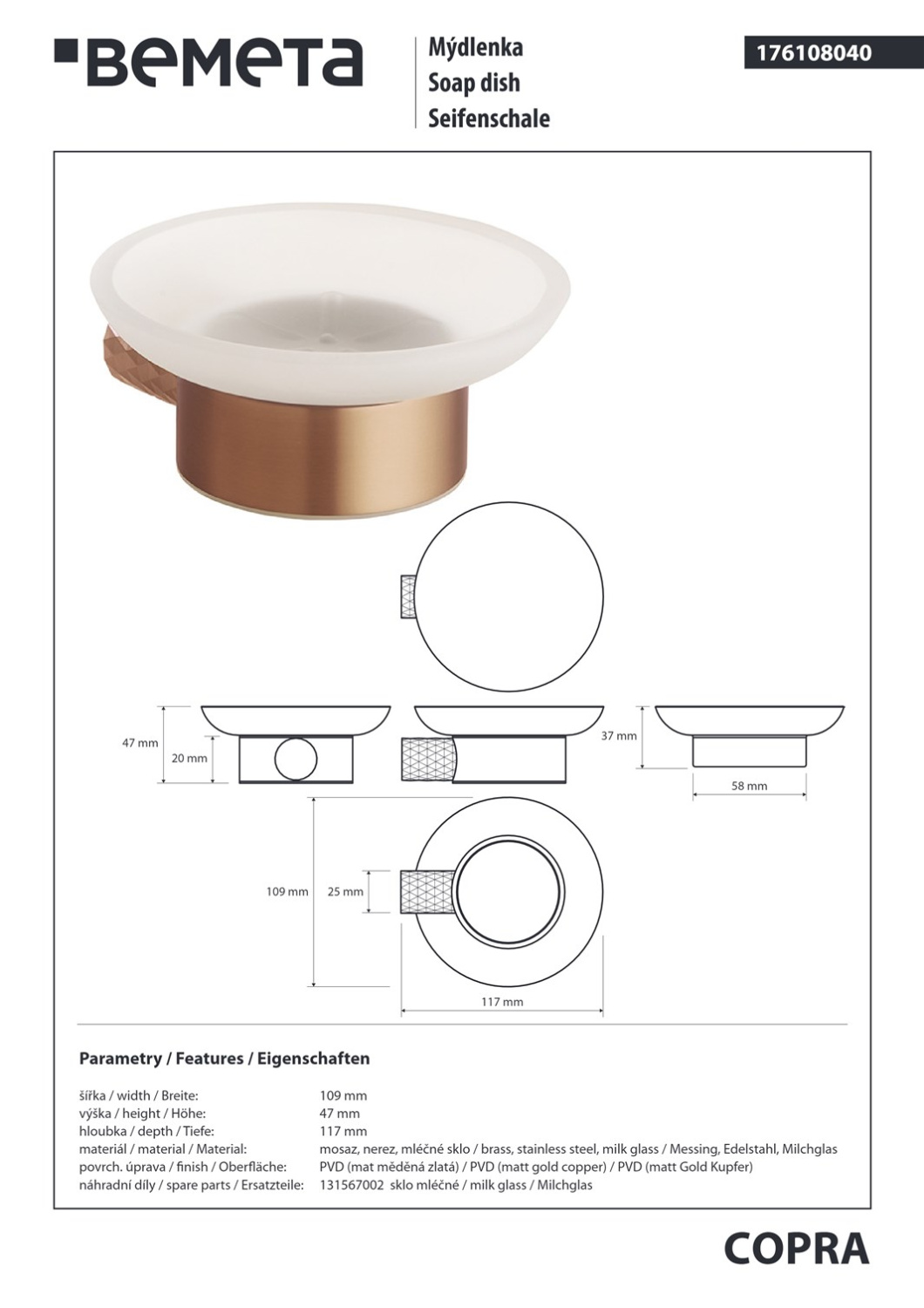 Закажите Bemeta Copra Мыльница со стеклянной чашей, подвесная, цвет: матовая медь 176108040 от производителя Bemeta, коллекция Copra в салоне европейской сантехники Дизайн Сантехники с быстрой доставкой по Москве. Представлены подробные характеристики и фотографии, которые позволят сделать правильный выбор и заказать товар.