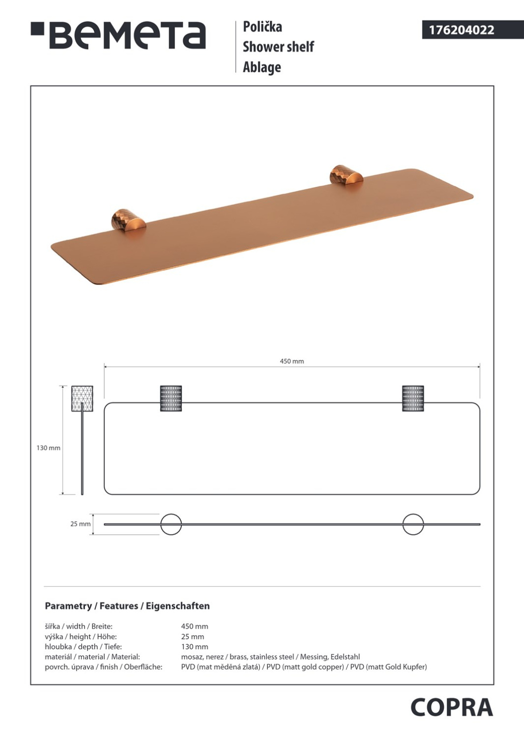 Bemeta Copra Полка подвесная 45 см, цвет: матовая медь 176204022 и другие сантехнические изделия бренда характеризует надежность, высокое качество и продолжительный срок службы. Изделие в стилистике арт-деко впечатляюще будет смотреться в различных цветовых решениях помещения.