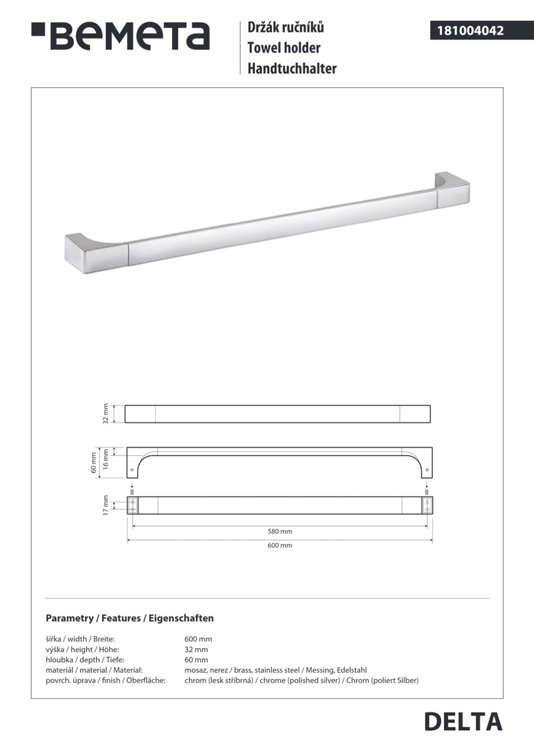 Bemeta Delta Полотенцедержатель 60 см, подвесной, цвет: полированная сталь 181004042 и другие сантехнические изделия бренда характеризует надежность, высокое качество и продолжительный срок службы. Изделие в стилистике арт-деко впечатляюще будет смотреться в различных цветовых решениях помещения.