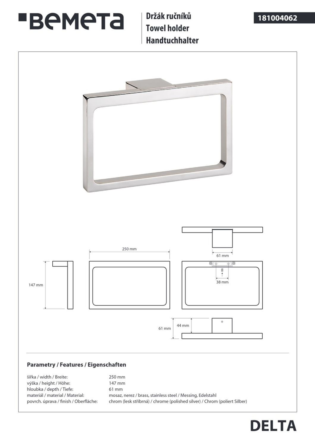 Bemeta Delta Полотенцедержатель-кольцо 25 см, подвесной, цвет: полированная сталь 181004062 и другие сантехнические изделия бренда характеризует надежность, высокое качество и продолжительный срок службы. Изделие в стилистике арт-деко впечатляюще будет смотреться в различных цветовых решениях помещения.