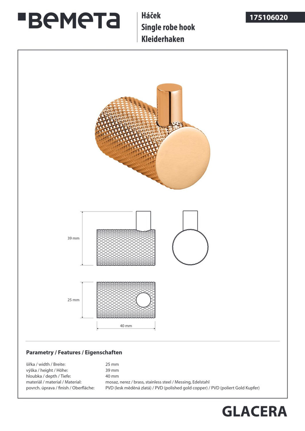 Bemeta Glacera Крючок для полотенца, подвесной, цвет: полированная медь 175106020 и другие сантехнические изделия бренда характеризует надежность, высокое качество и продолжительный срок службы. Изделие в стилистике арт-деко впечатляюще будет смотреться в различных цветовых решениях помещения.