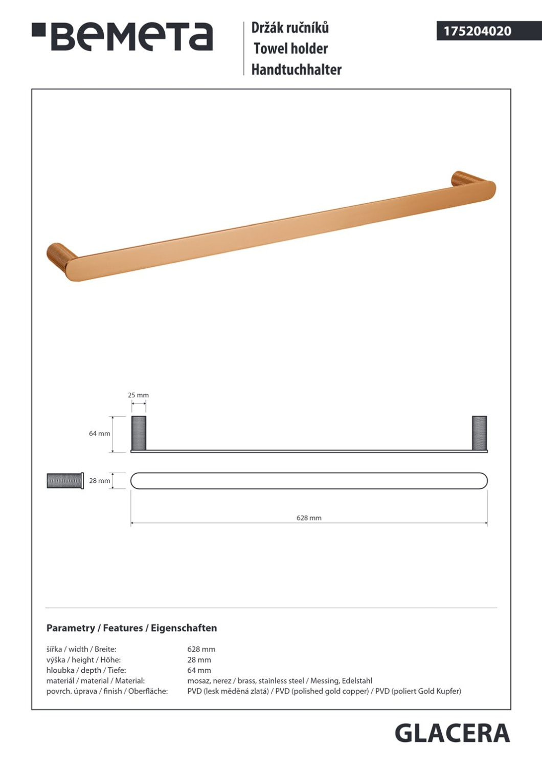 Закажите Bemeta Glacera Полотенцедержатель 62,8 см, подвесной, цвет: полированная медь 175204020 от производителя Bemeta, коллекция Glacera в салоне европейской сантехники Дизайн Сантехники с быстрой доставкой по Москве. Представлены подробные характеристики и фотографии, которые позволят сделать правильный выбор и заказать товар.
