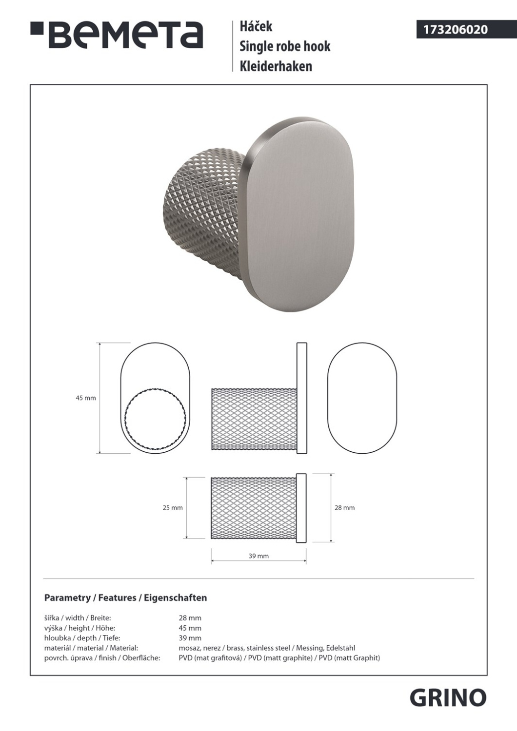 Bemeta Grino Крючок для полотенца, подвесной, цвет: графит 173206020 и другие сантехнические изделия бренда характеризует надежность, высокое качество и продолжительный срок службы. Изделие в стилистике арт-деко впечатляюще будет смотреться в различных цветовых решениях помещения.