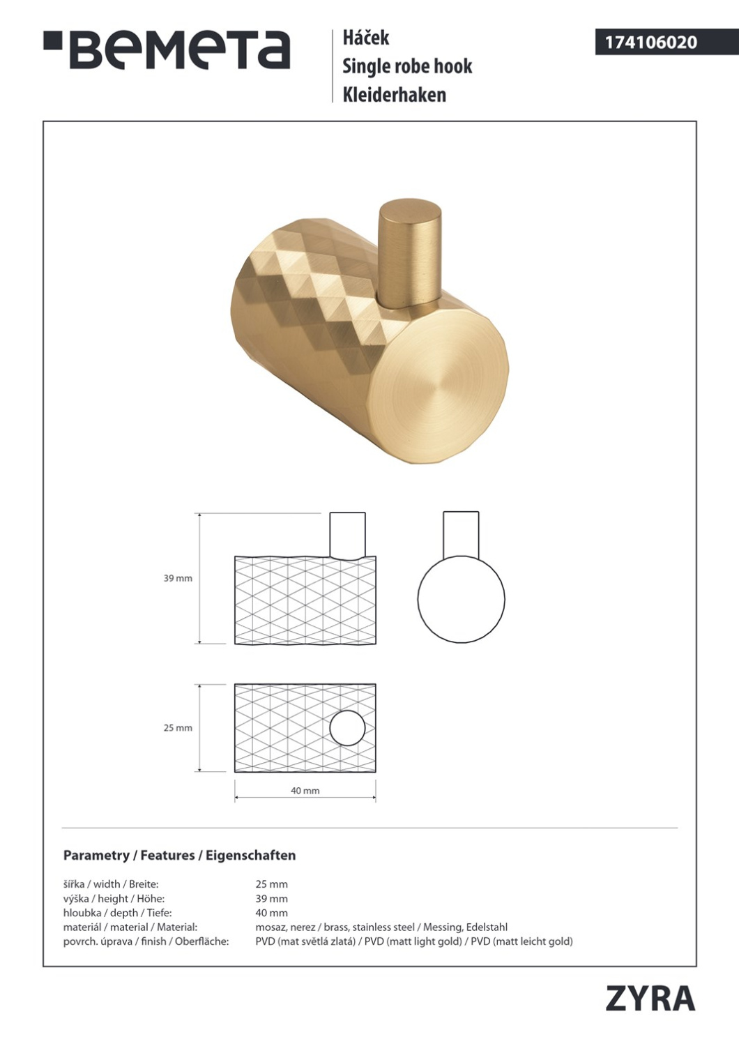 Bemeta Zyra Крючок для полотенца, подвесной, цвет: матововое золото-шампань 174106020 и другие сантехнические изделия бренда характеризует надежность, высокое качество и продолжительный срок службы. Изделие в стилистике арт-деко впечатляюще будет смотреться в различных цветовых решениях помещения.