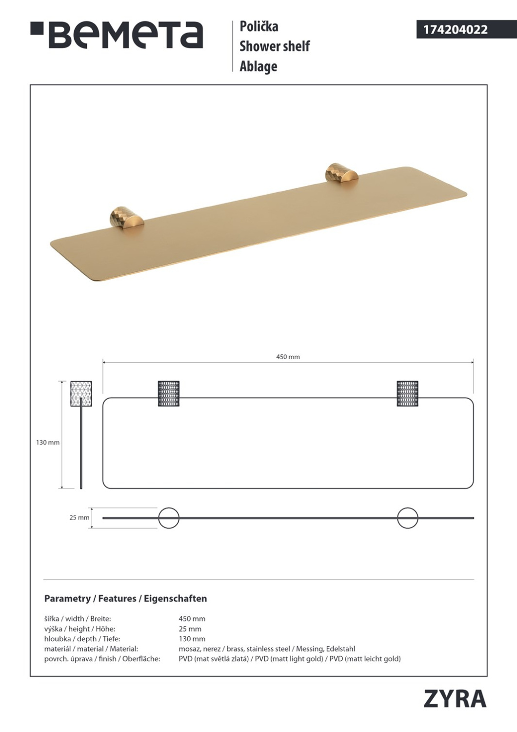 Bemeta Zyra Полка подвесная 45 см, цвет: матововое золото-шампань 174204022 и другие сантехнические изделия бренда характеризует надежность, высокое качество и продолжительный срок службы. Изделие в стилистике арт-деко впечатляюще будет смотреться в различных цветовых решениях помещения.