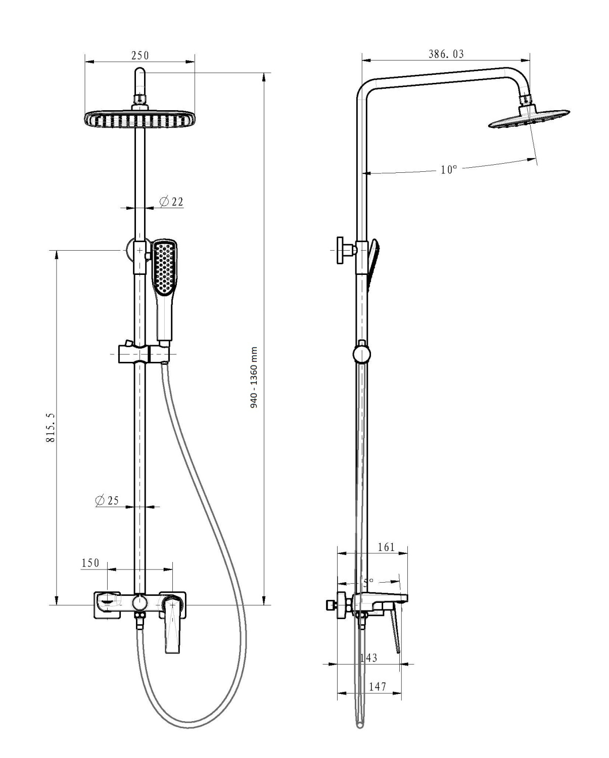 Boheme Venturo Душевая стойка: смеситель, излив, ручной душ, шланг, верхний душ 25 см, цвет: black 378-B