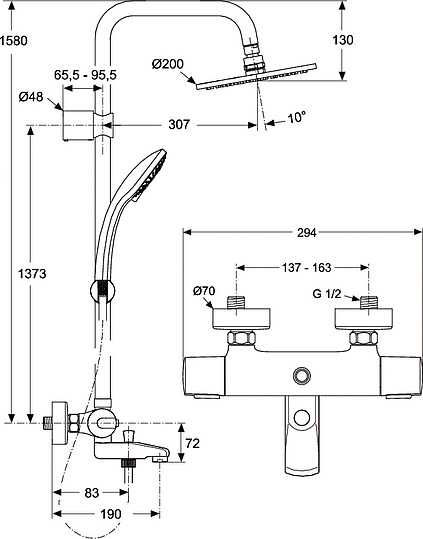 Ideal Standard IdealRain Душевая стойка: термостат, верхний душ, штанга 158 см, цвет: chrome A5778AA и другие сантехнические изделия бренда характеризует надежность, высокое качество и продолжительный срок службы. Изделие в стилистике минимализм впечатляюще будет смотреться в различных цветовых решениях помещения.