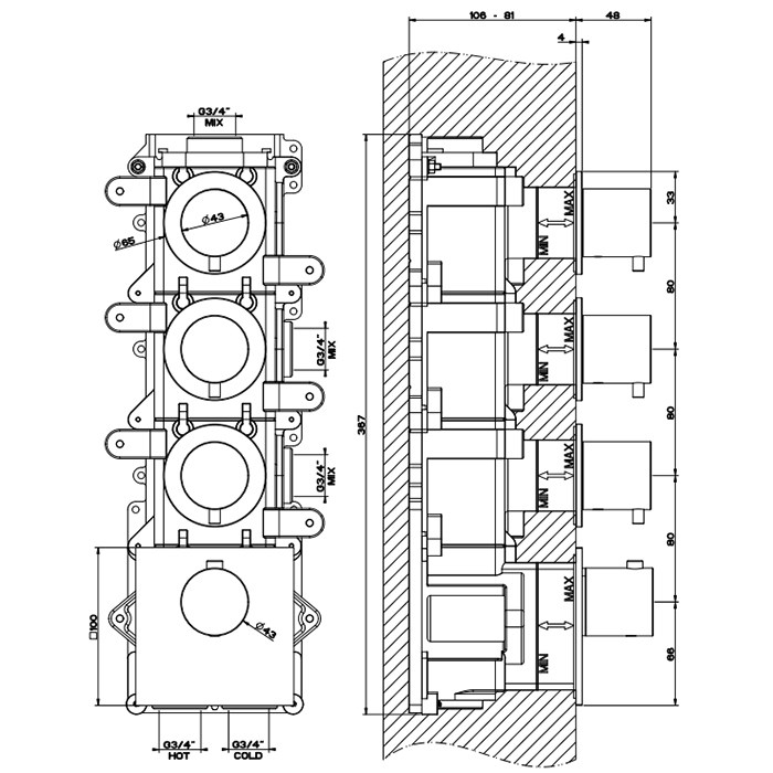 Gessi 316 Смеситель для душа термостатический 3 потребителя, встраиваемый, цвет: matte black 54506#299 и другие сантехнические изделия бренда характеризует надежность, высокое качество и продолжительный срок службы. Изделие в стилистике лофт впечатляюще будет смотреться в различных цветовых решениях помещения.