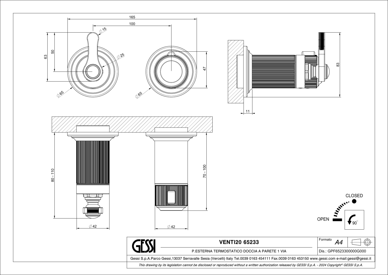 Gessi Venti20 Смеситель для душа встраиваемый, на 2 потребителя, внешняя часть, цвет: gold PVD 65036#246