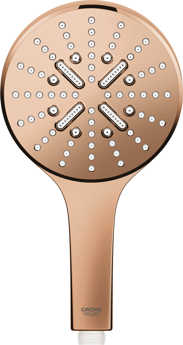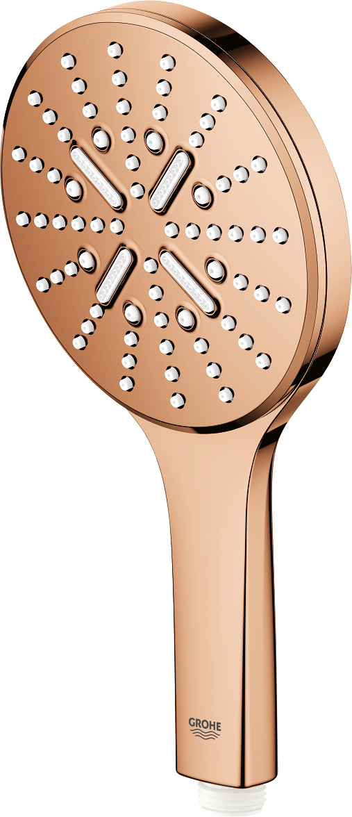 Grohe Rainshower SmartActive 130 Ручной душ, 3 вида струи, цвет: теплый закат 26574DA0 и другие сантехнические изделия бренда характеризует надежность, высокое качество и продолжительный срок службы. Изделие в стилистике минимализм впечатляюще будет смотреться в различных цветовых решениях помещения.