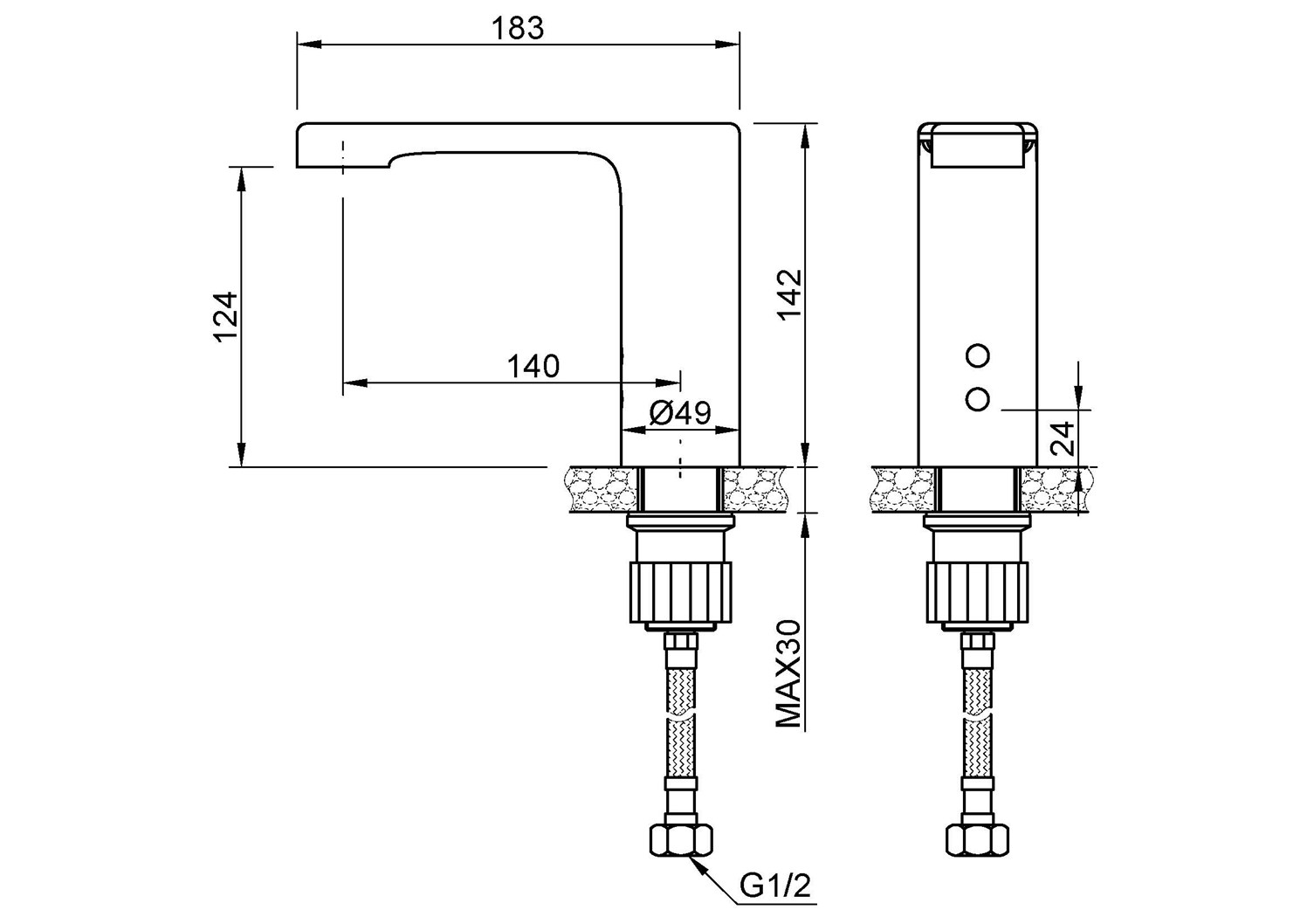 Автоматический водопроводный кран для умывальника черного цвета.. Установка на столешницу с автоматической системой активации через встроенный в нее инфракрасный датчик Работа от сети 220 В 50/60 Гц или от 4 батареек АА, обеспечивающих 6 В в случае сбоя питания. Расход 6 л / мин при давлении 3 бара Материал: хромированная латунь CW617N Размеры: 142 высота x 49 ширина x 183 глубина (мм).