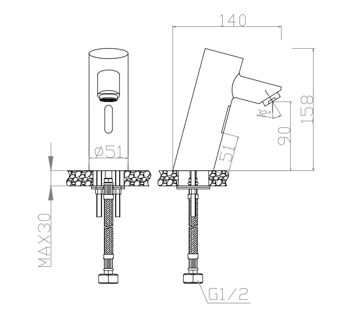 Автоматический водопроводный кран для умывальника. Установка на столешницу с автоматической системой активации через встроенный в нее инфракрасный датчик Кран работает от 4 батареек АА, которые обеспечивают напряжение 6 В, или может быть подключен к электрической сети с помощью модуля (не включен в комплект) (220 В, 50/60 Гц). Расход 6 л / мин при давлении 3 бара Материал: хромированная латунь CW617N.