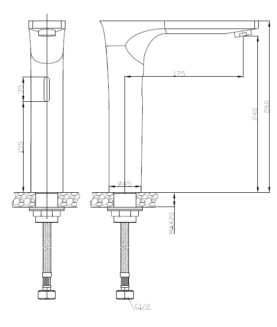 Автоматический водопроводный кран для умывальника глянцевый.. Установка на столешницу с автоматической системой активации через встроенный в нее инфракрасный датчик. Встроенная система против образования легионеллы. Работа от сети 220 В 50/60 Гц или от 4 батареек АА, обеспечивающих 6 В в случае сбоя питания. Расход 6 л / мин при давлении 3 бара Материал: хромированная латунь CW617N Размеры: 260 высота x 45 ширина x 220 глубина (мм).