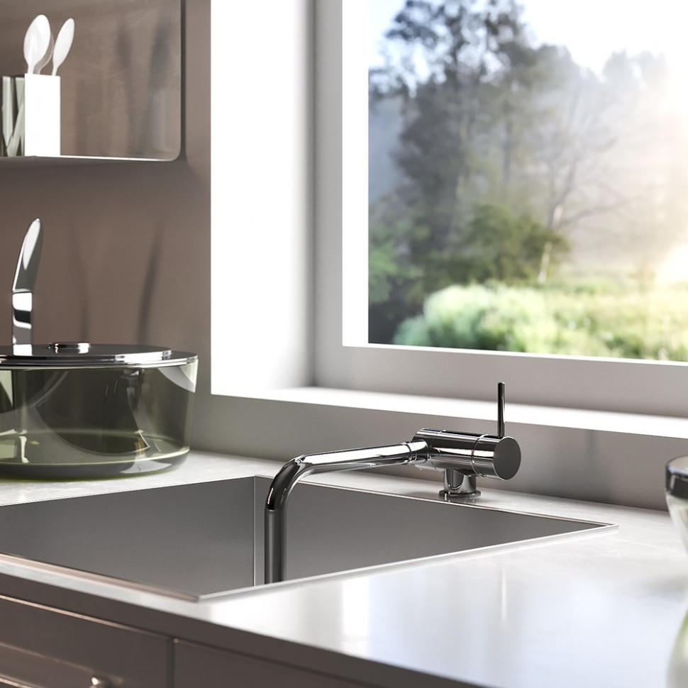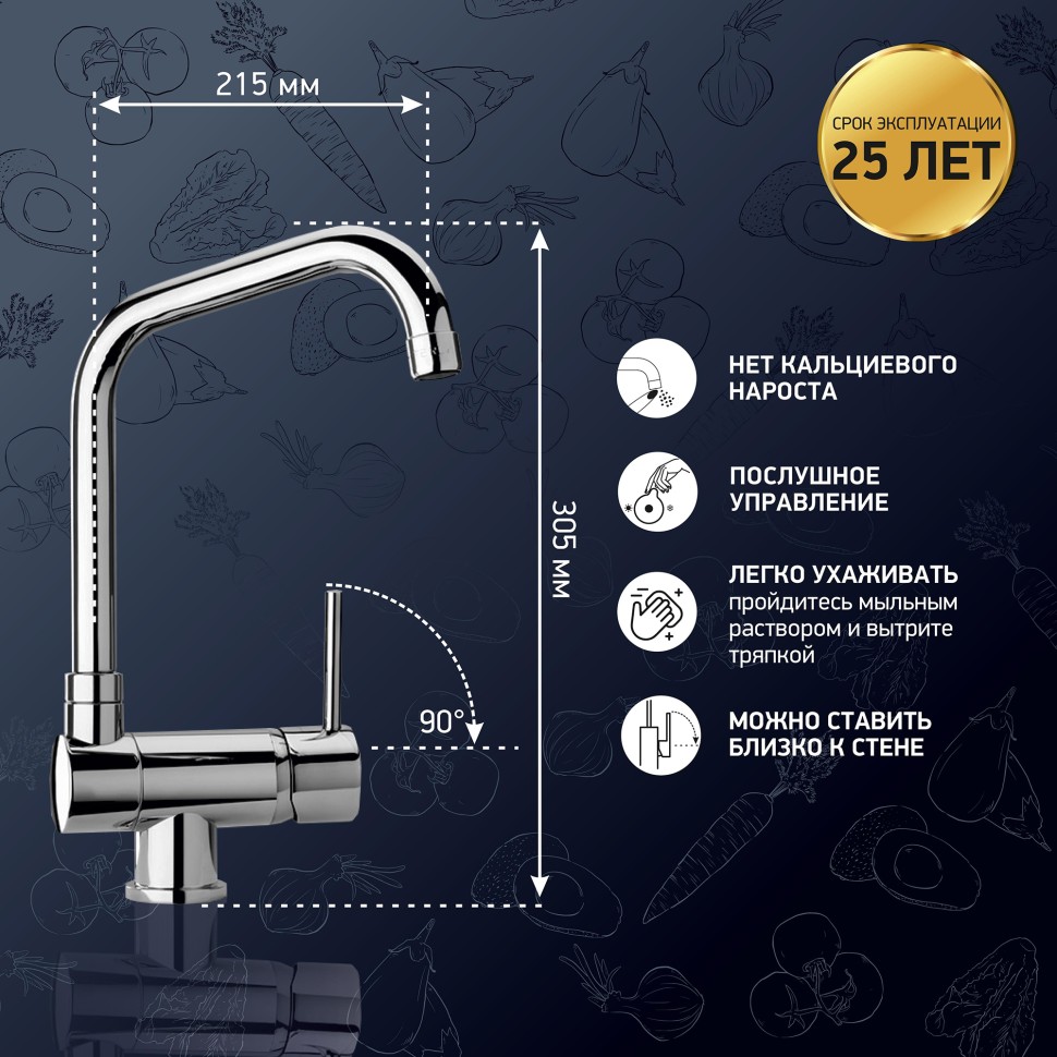 Paini Cox Смеситель для кухни с поворотным изливом, на 1 отв., высота излива 21,7 см, цвет: хром 78CR582KM и другие сантехнические изделия бренда характеризует надежность, высокое качество и продолжительный срок службы. Изделие в стилистике минимализм впечатляюще будет смотреться в различных цветовых решениях помещения.