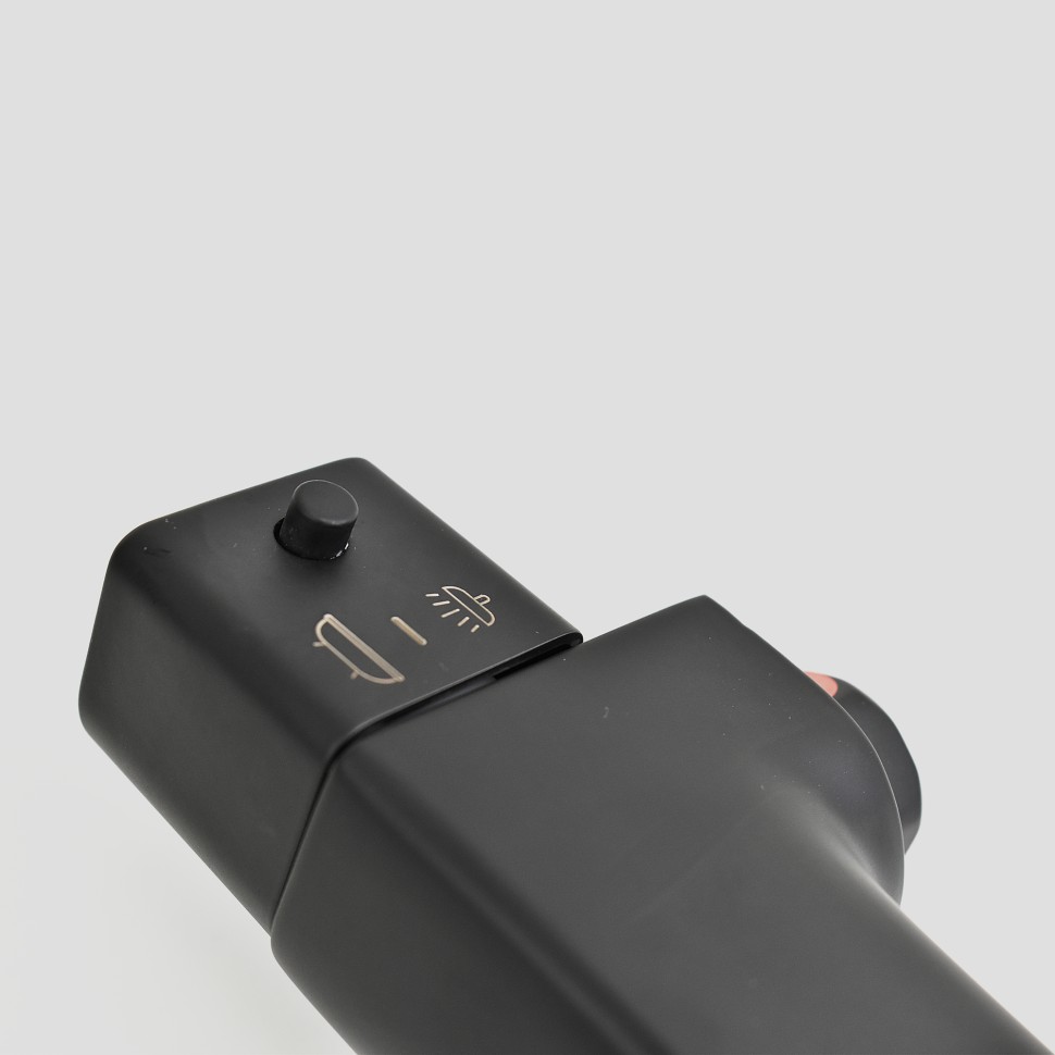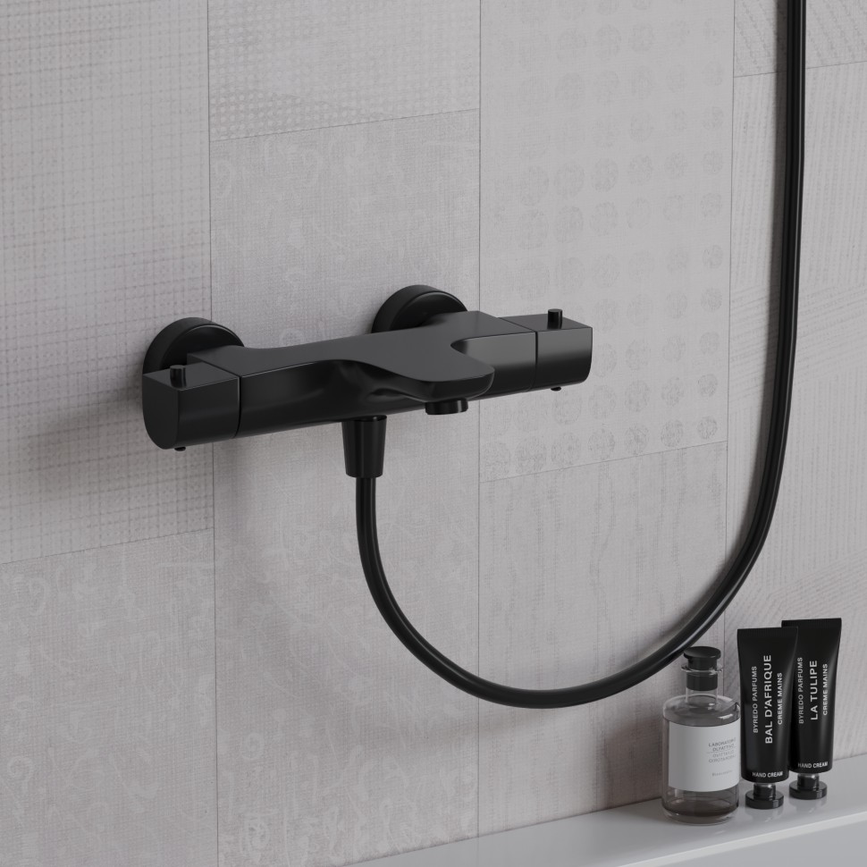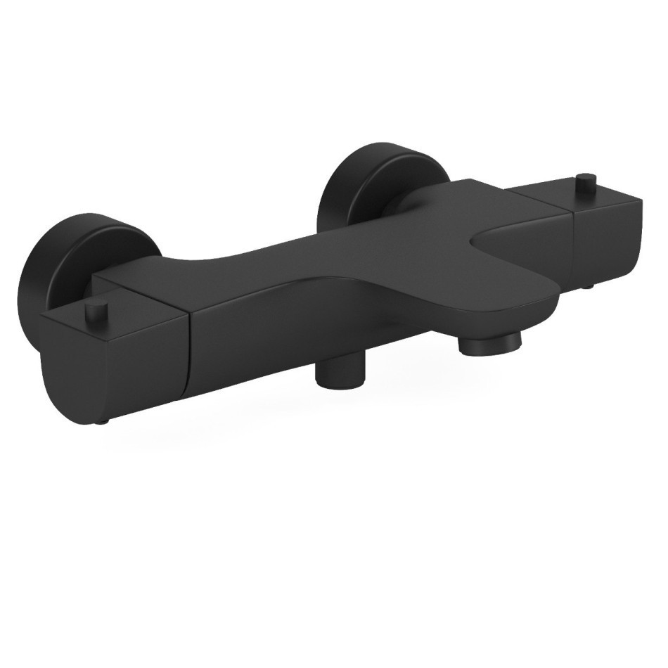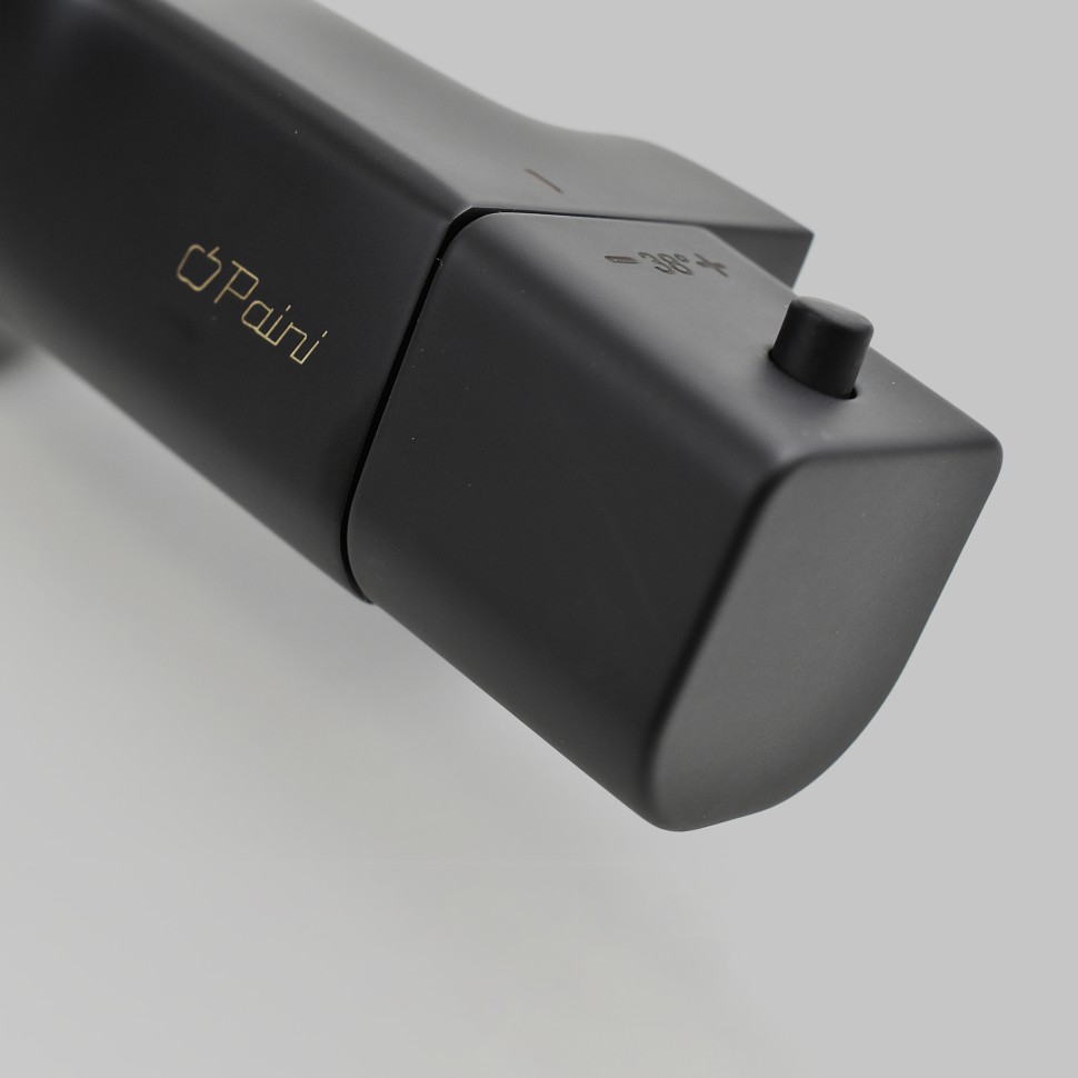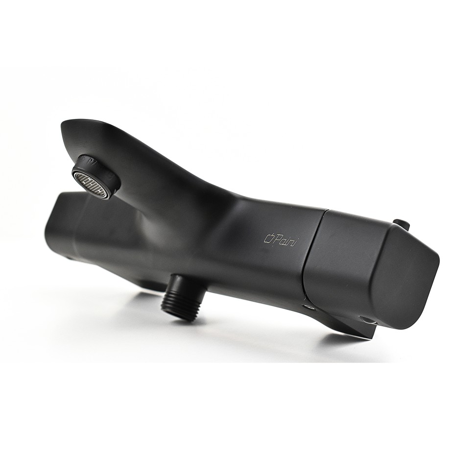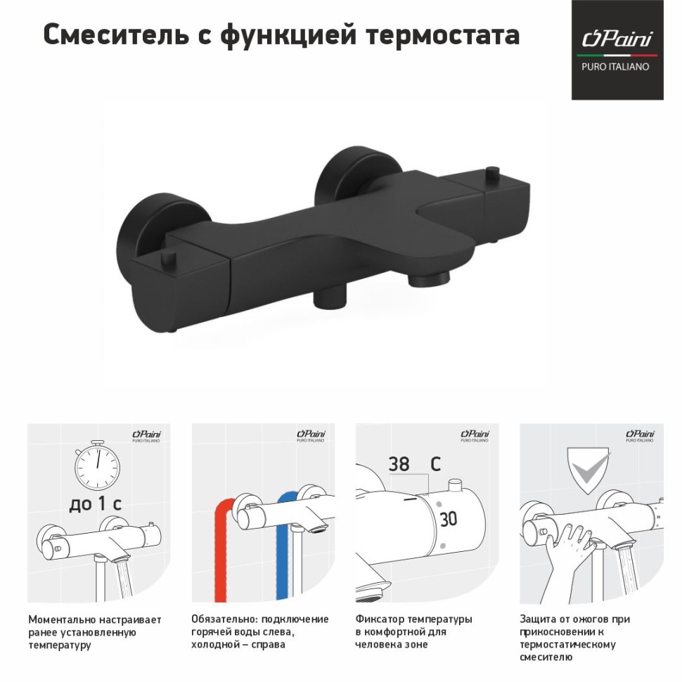 Paini Nove Смеситель для ванны с термостатом, на 2 отверстия, излив 17,6 см, цвет: черный матовый 09YO111TH и другие сантехнические изделия бренда характеризует надежность, высокое качество и продолжительный срок службы. Изделие в стилистике минимализм впечатляюще будет смотреться в различных цветовых решениях помещения.