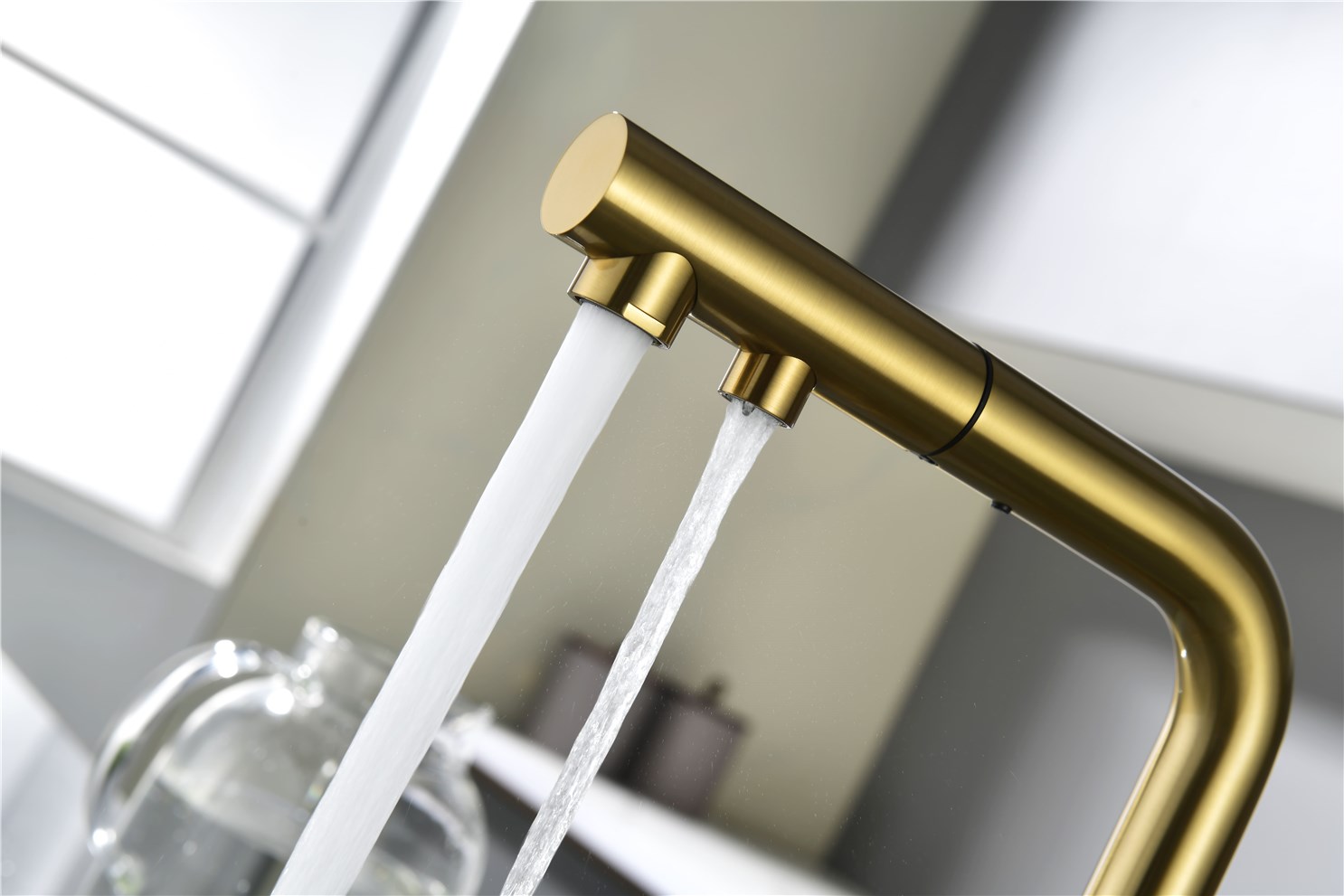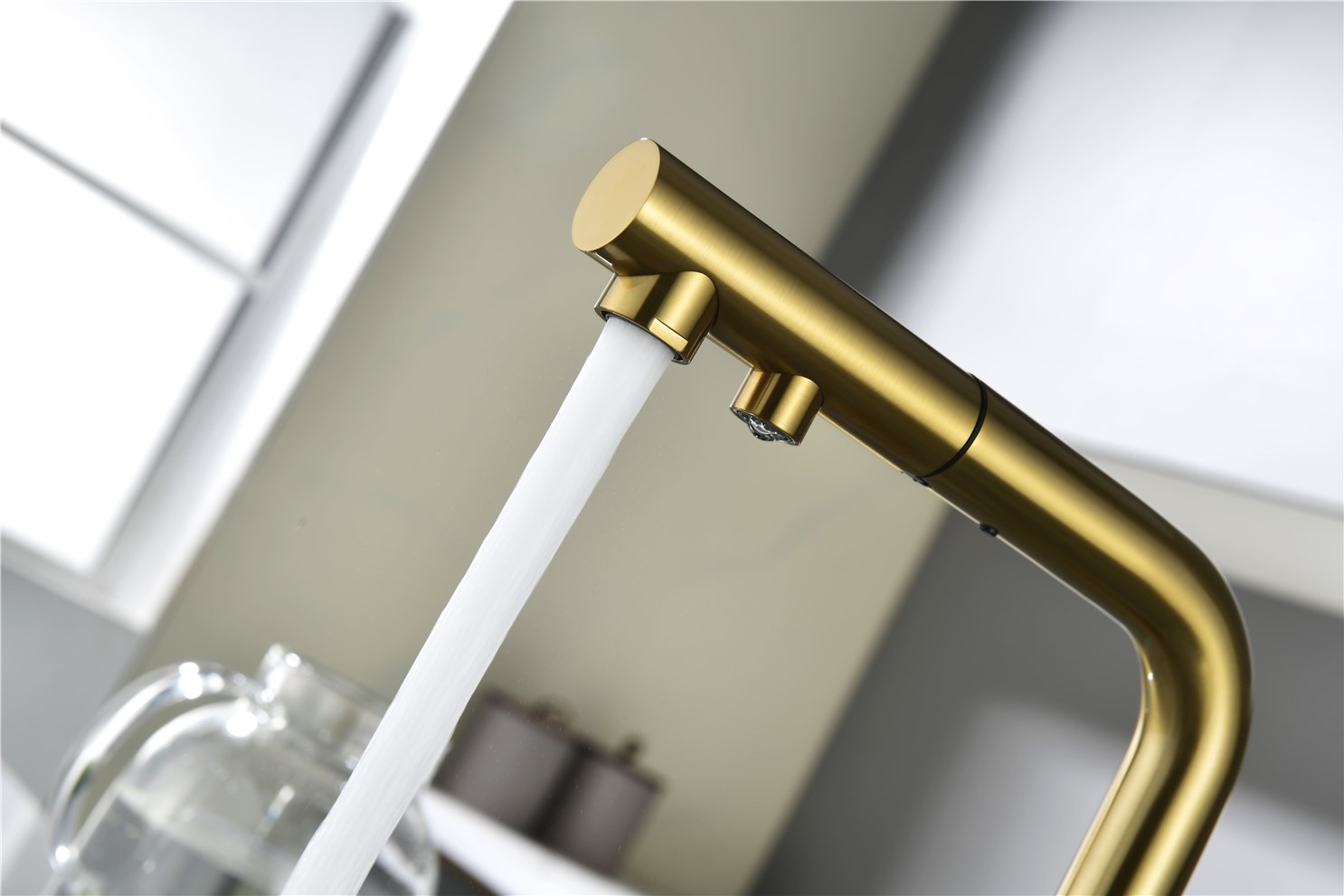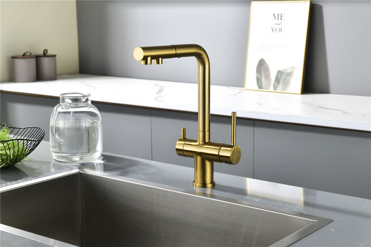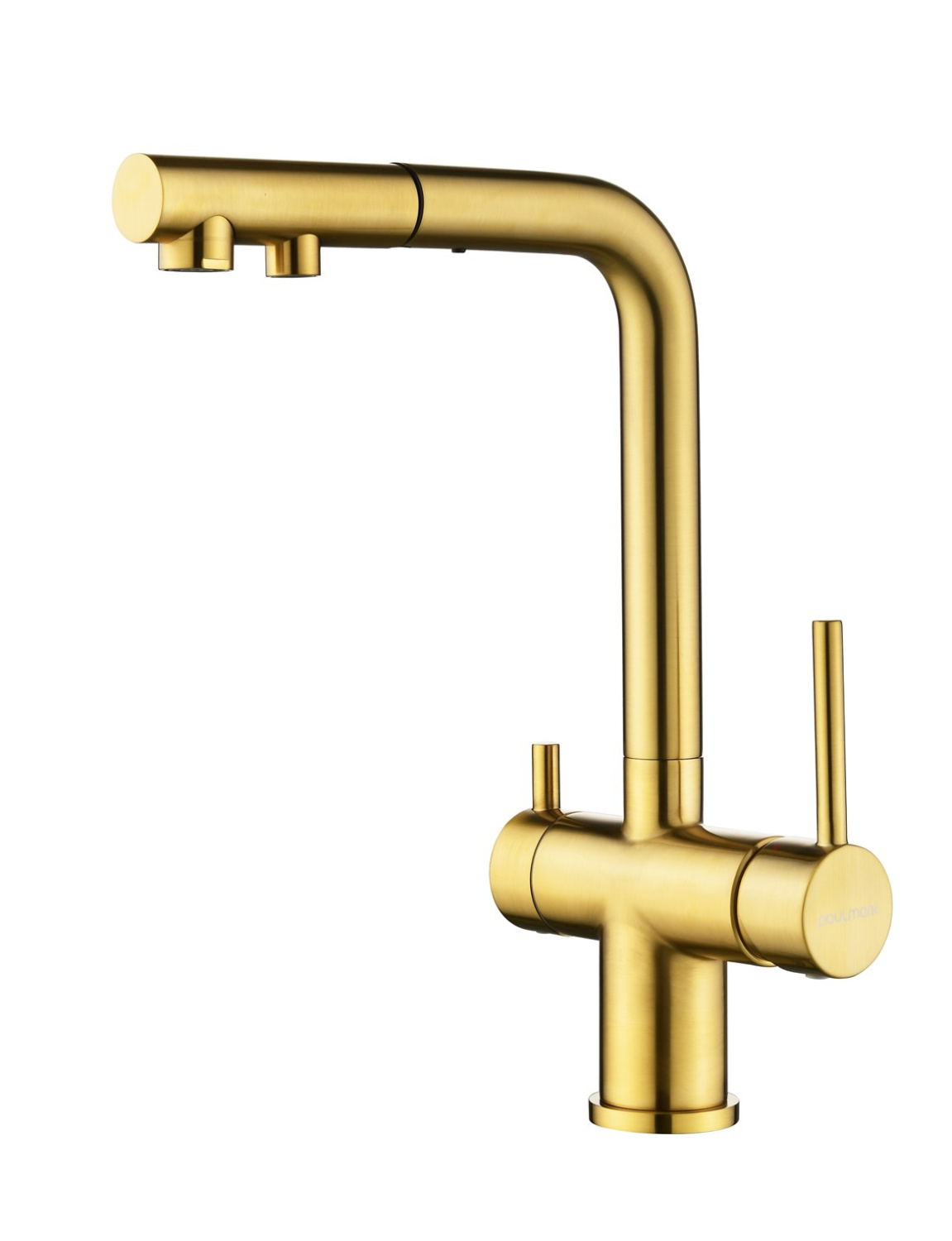 Paulmark Serpentine Смеситель для кухни с выдвижным изливом и подключ. фильтра, цвет: браш. золото Se213222-BG и другие сантехнические изделия бренда характеризует надежность, высокое качество и продолжительный срок службы. Изделие в стилистике минимализм впечатляюще будет смотреться в различных цветовых решениях помещения.