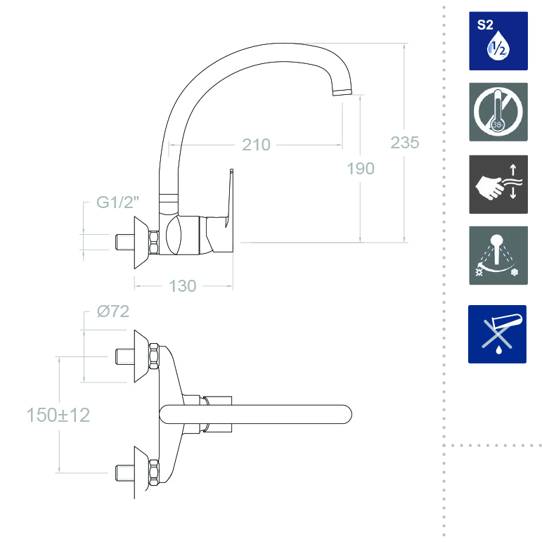 Ramonsoler Titanium Смеситель для кухни настенный однорычажный, цвет: хром 1817CC и другие сантехнические изделия бренда характеризует надежность, высокое качество и продолжительный срок службы. Изделие в стилистике минимализм впечатляюще будет смотреться в различных цветовых решениях помещения.
