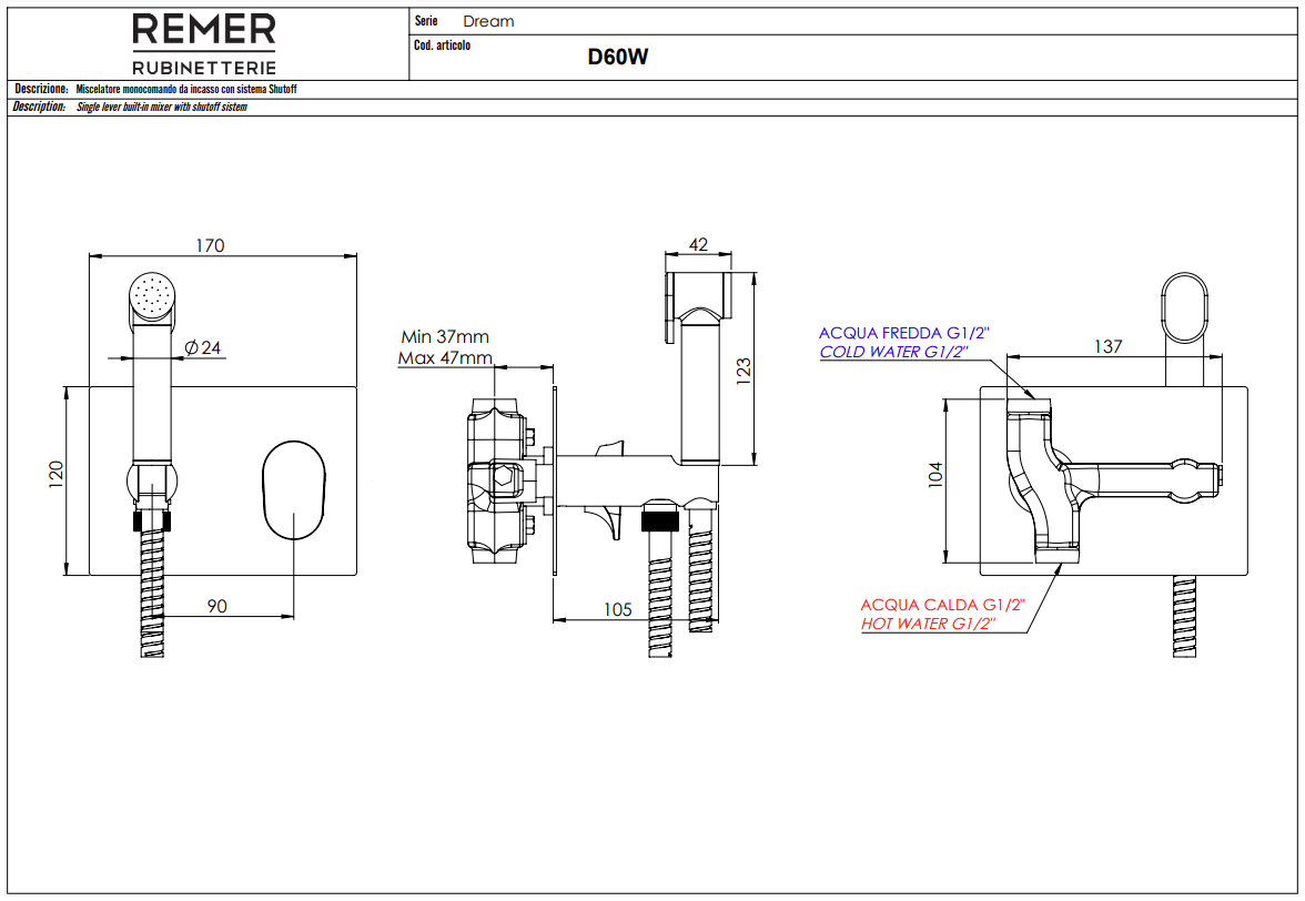 Закажите Remer Dream Гигиенический душ со смесителем, шланг 120 см, с встраиваемой частью, цвет: cromo D60W от производителя Remer, коллекция Dream в салоне европейской сантехники Дизайн Сантехники с быстрой доставкой по Москве. Представлены подробные характеристики и фотографии, которые позволят сделать правильный выбор и заказать товар.