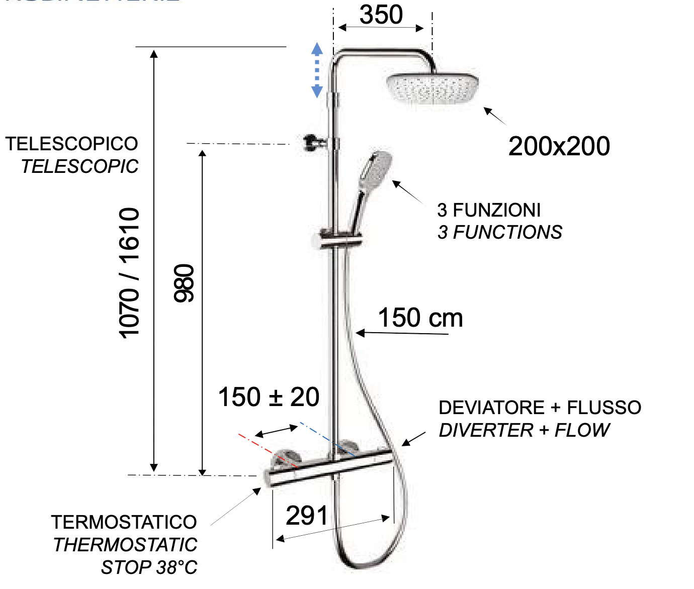 Remer Elegance Душевая стойка: термостат, верхний душ 20 см, лейка, штанга 161 см, цвет: cromo EQ32A8CPAD20 и другие сантехнические изделия бренда характеризует надежность, высокое качество и продолжительный срок службы. Изделие в стилистике минимализм впечатляюще будет смотреться в различных цветовых решениях помещения.