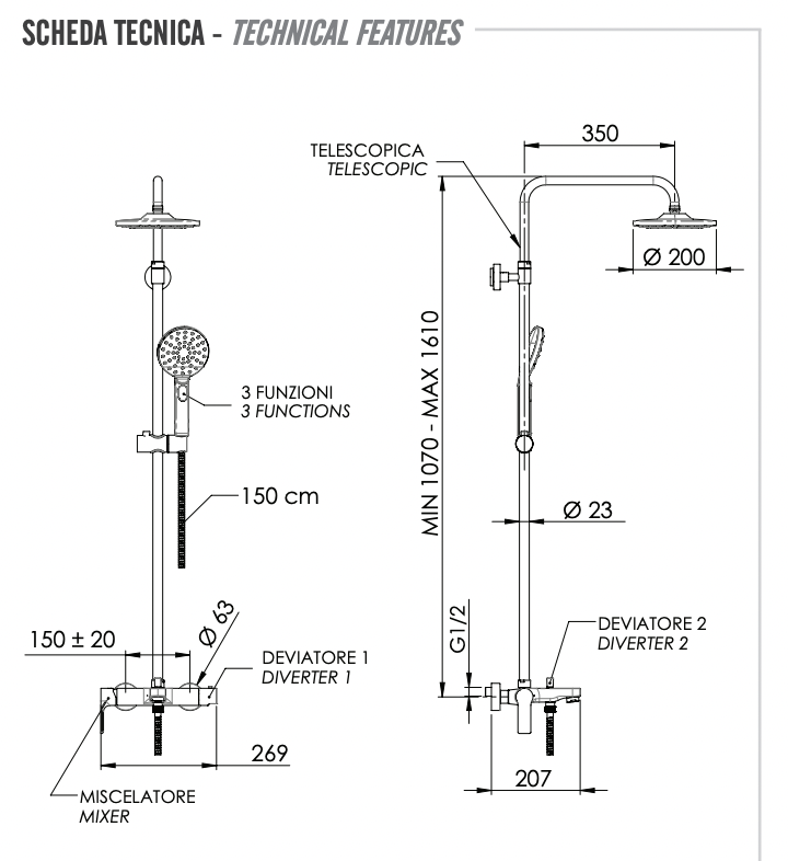 Remer Energy Душевая стойка: смеситель, верхний душ 20 см, лейка, штанга 161 см, шланг, цвет: cromo EY34AEC20 и другие сантехнические изделия бренда характеризует надежность, высокое качество и продолжительный срок службы. Изделие в стилистике минимализм впечатляюще будет смотреться в различных цветовых решениях помещения.