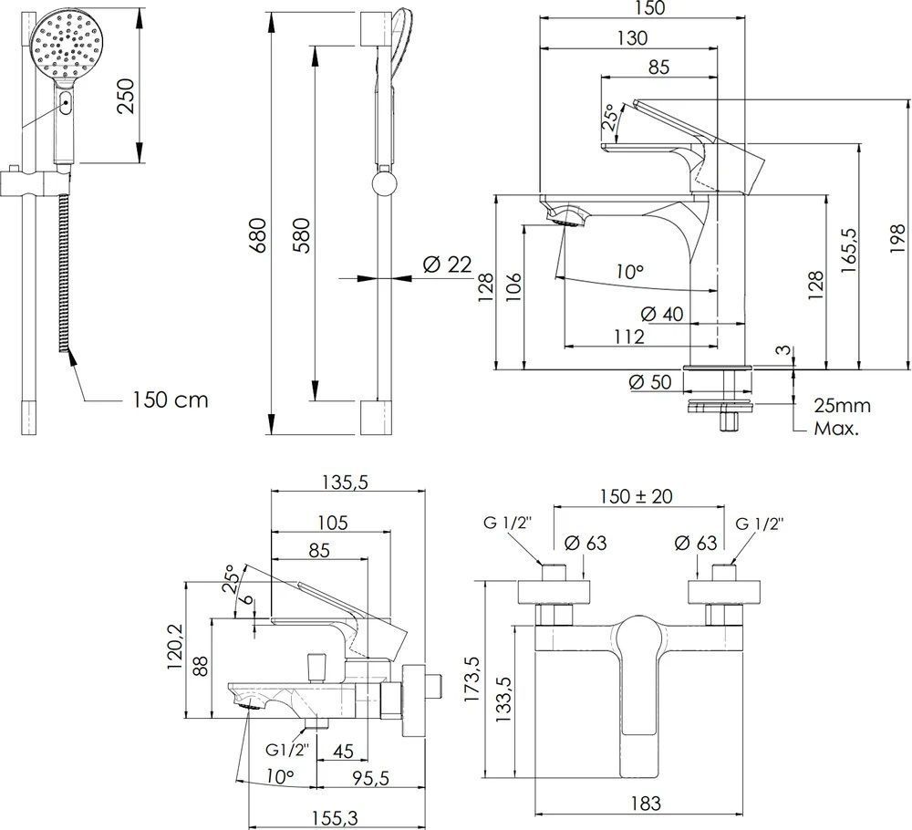 Remer Energy Душевой комплект: 2 смесителя, лейка 4 режима, штанга 68 см, шланг 150 см, цвет: cromo EY0512315LMPI и другие сантехнические изделия бренда характеризует надежность, высокое качество и продолжительный срок службы. Изделие в стилистике минимализм впечатляюще будет смотреться в различных цветовых решениях помещения.