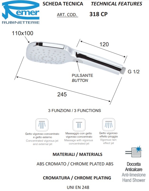 Закажите Remer Ручной душ, 3 вида струи, цвет: cromo 318CPX от производителя Remer, коллекция Remer в салоне европейской сантехники Дизайн Сантехники с быстрой доставкой по Москве. Представлены подробные характеристики и фотографии, которые позволят сделать правильный выбор и заказать товар.