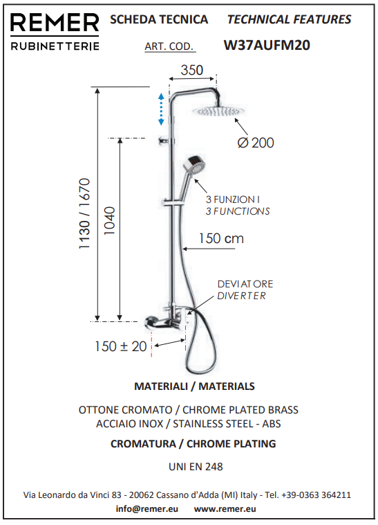 Remer Winner Душевая стойка: смеситель, верхний душ 20 см, лейка, штанга 166 см, шланг, цвет: cromo W37AUFM20 и другие сантехнические изделия бренда характеризует надежность, высокое качество и продолжительный срок службы. Изделие в стилистике минимализм впечатляюще будет смотреться в различных цветовых решениях помещения.