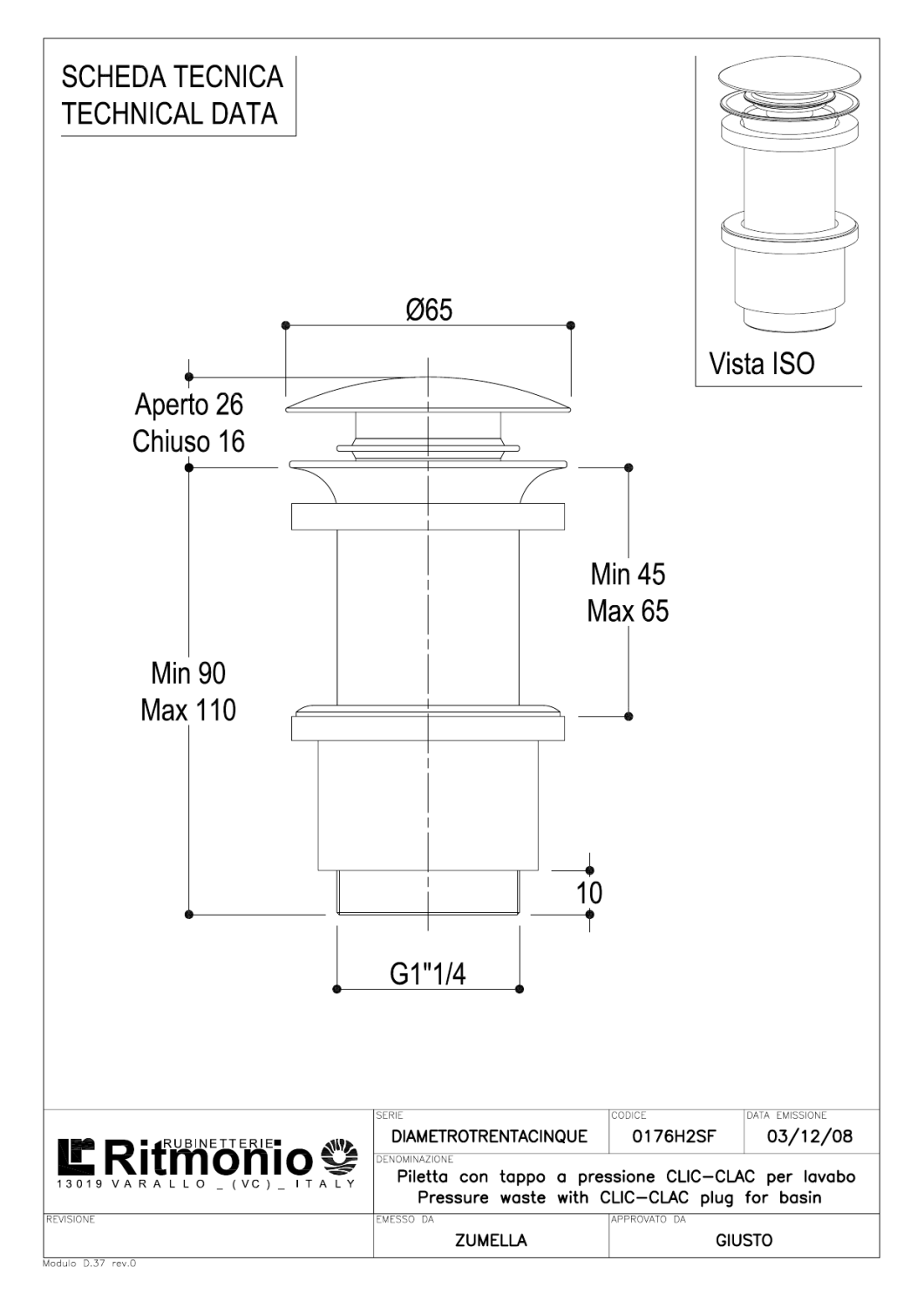 Ritmonio Донный клапан Click-Clack для раковины, без перелива, цвет: chrome E0BA0176H2SFCRL