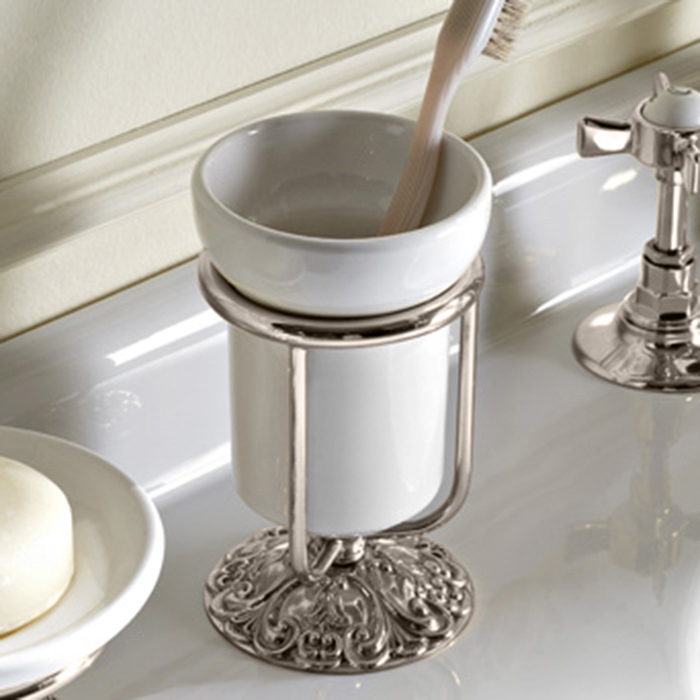 Sbordoni Flora Стакан настольный, керамический, цвет: никель FL201NI и другие сантехнические изделия бренда характеризует надежность, высокое качество и продолжительный срок службы. Изделие в стилистике английская классика впечатляюще будет смотреться в различных цветовых решениях помещения.