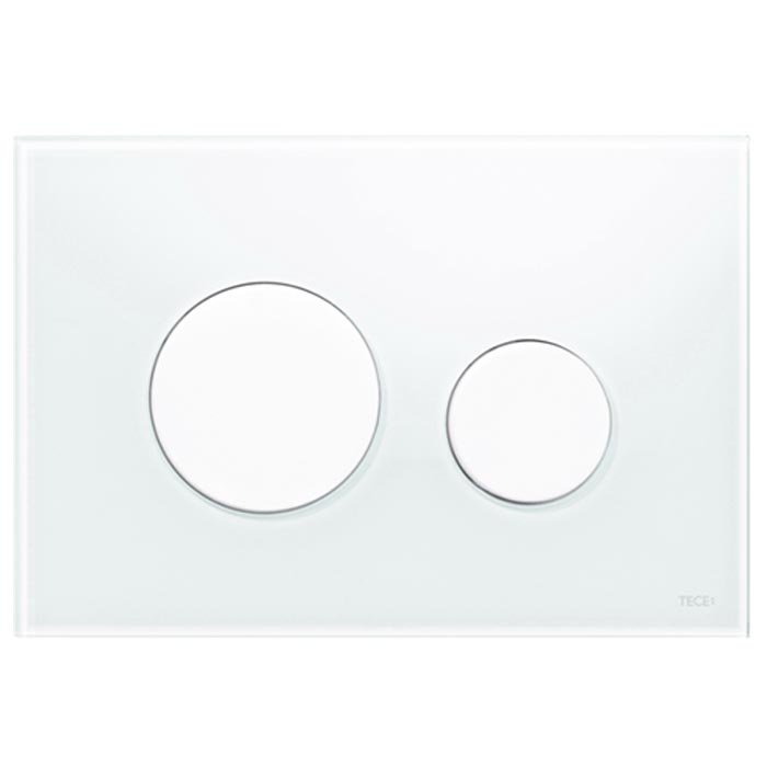 Панель смыва для смывных бачков Tece, фронтальная или верхняя установка. Плоская стеклянная панель смыва с двумя установленными на пружинах клавишами смыва. Подходит для монтажа на уровне стены вместе с монтажной рамкой унитаза (например: 9240649). Совместима с контейнером для гигиенических таблеток.