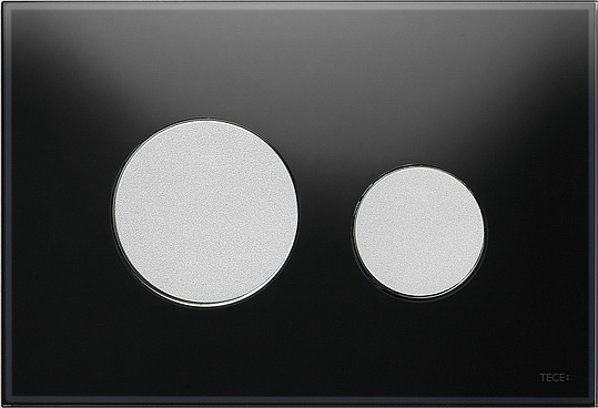 Панель смыва для смывных бачков Tece, фронтальная или верхняя установка. Плоская стеклянная панель смыва с двумя установленными на пружинах клавишами смыва. Подходит для монтажа на уровне стены вместе с монтажной рамкой унитаза (например: 9240649). Совместима с контейнером для гигиенических таблеток.
