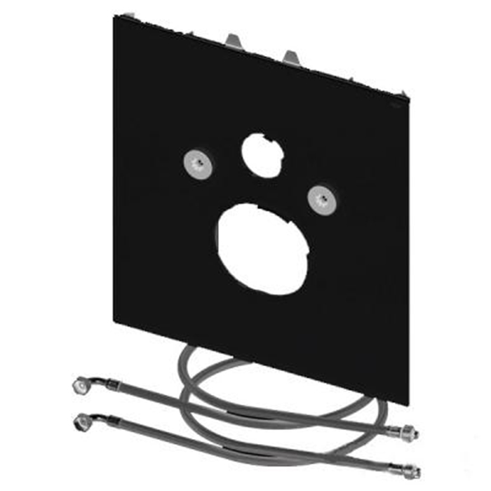 Нижняя стеклянная панель для унитазов Tece One с функцией биде, включая звукоизоляционный комплект и армированные шланги для подсоединения горячей и холодной воды к стандартным угловым вентилям. Стекло черное.
