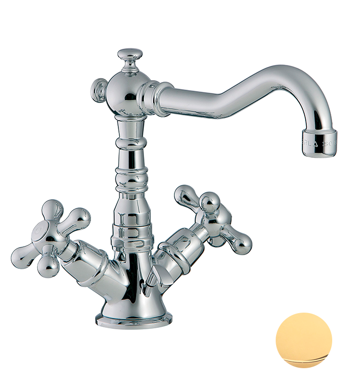 Treemme Romantica Смеситель для раковины, ручки PV, цвет: золото/керамика 3618DDPV и другие сантехнические изделия бренда характеризует надежность, высокое качество и продолжительный срок службы. Изделие в стилистике прованс впечатляюще будет смотреться в различных цветовых решениях помещения.